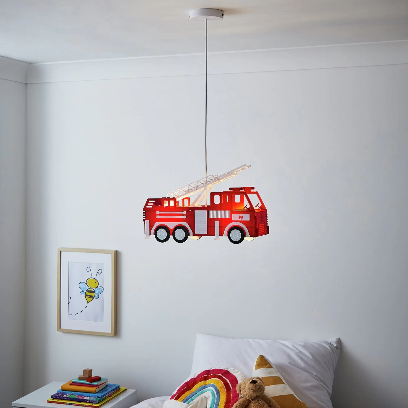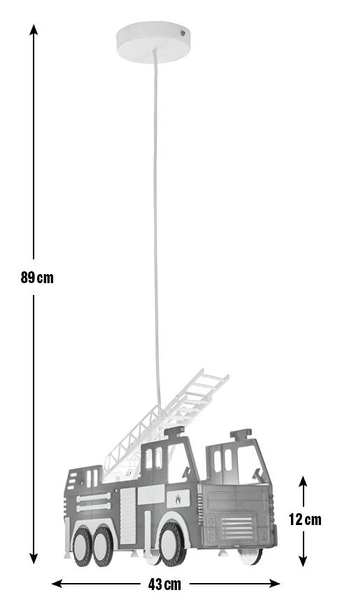 The Fire Engine Ceiling Light is the perfect choice for children who love toy cars and trucks. This ceiling pendant comes in a vibrant red finish with white accent for a colourful and eye-catching appearance. It also is height adjustable and looks ideal in kid's bedrooms or play rooms. Ideal for kid's playrooms or bedrooms.