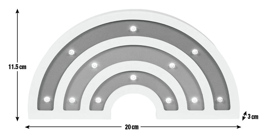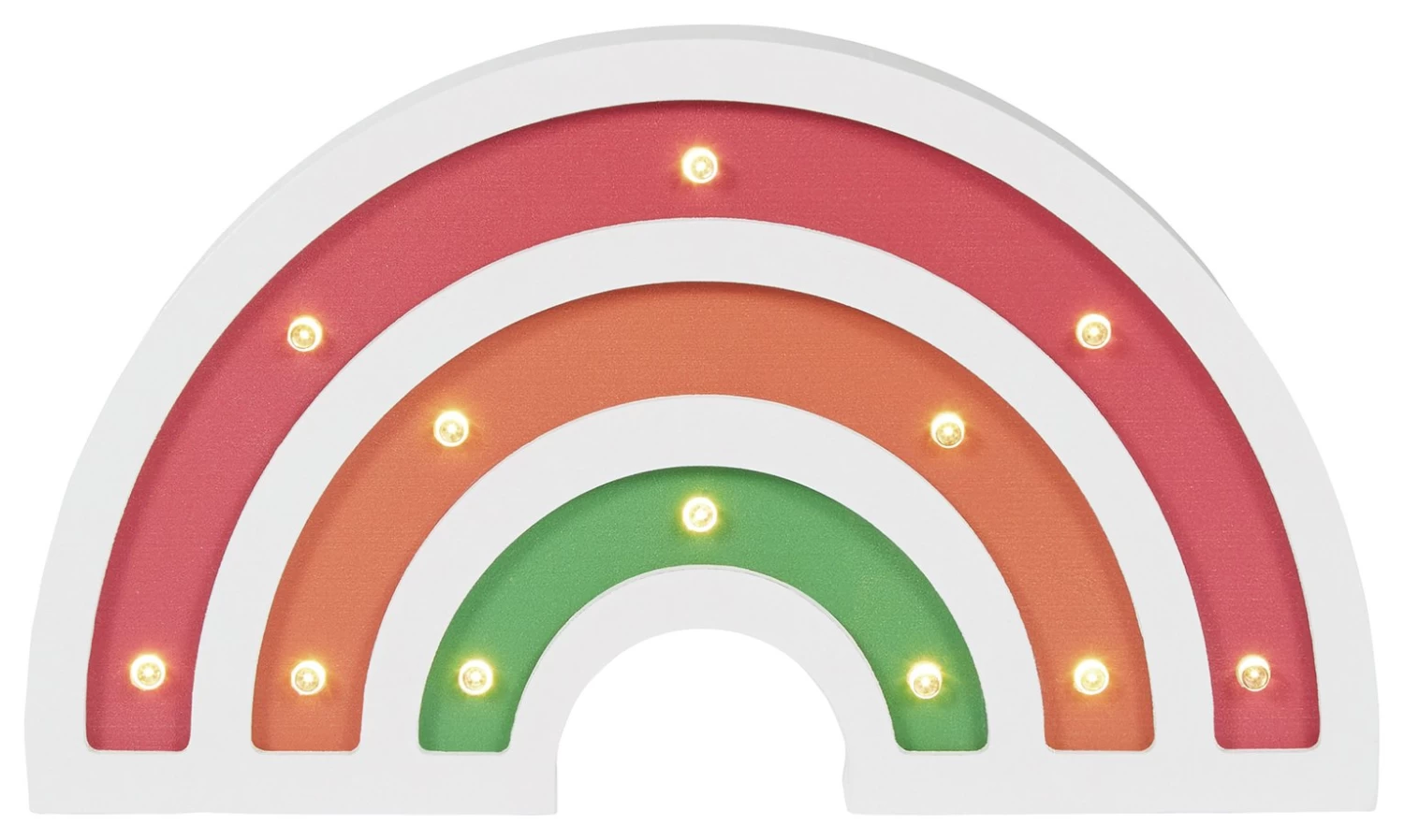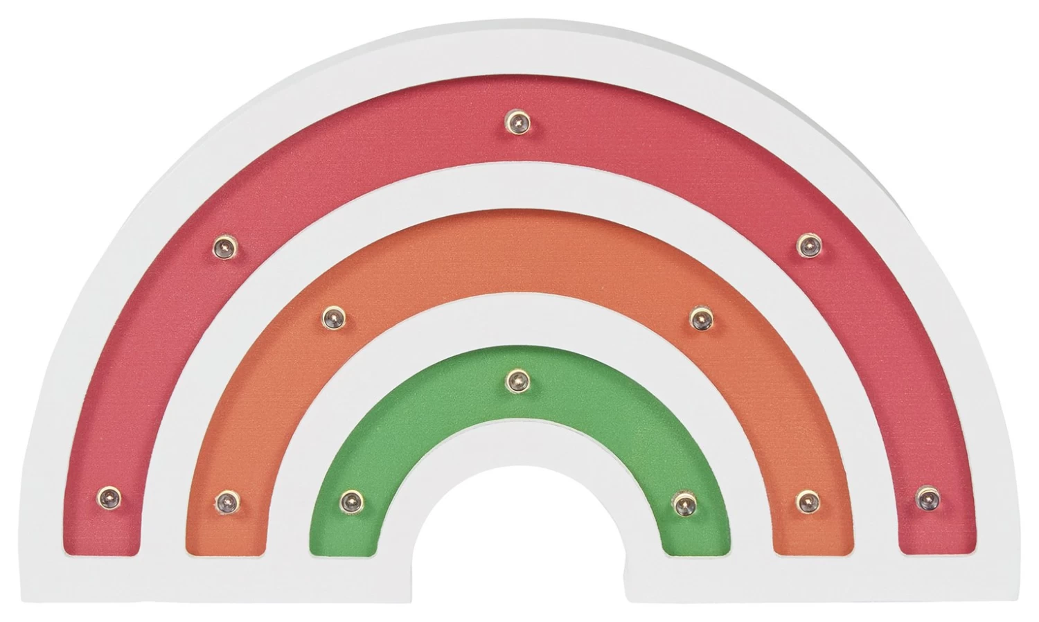 Colourful novelty lighting styles for children's rooms with the Rainbow Table Light. This battery-operated table lamp is multicoloured with a white outline for a fun aesthetic. It is also made of wood with LEDs dotted about the design for a retro fair-ground style appearance. Wooden design offers a retro appearance.