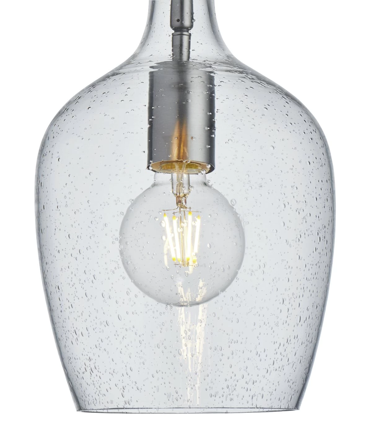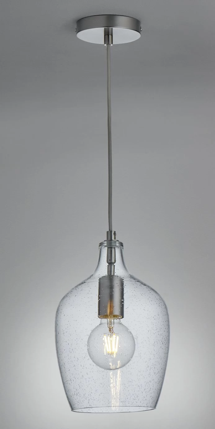 Bubbles and sparkles. This chrome and glass pendant features a clear glass globe injected with delightfully random bubbles. Turn the light on and enjoy the sprinkle of light patterns on your ceiling and walls. Set on a contemporary chrome fixed rod, the glass bottle pedant would create a stir in your kitchen or hang three in a row over your dining table for a stunning effect.