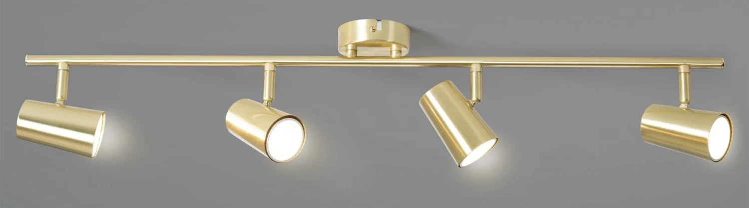 Ready for the spotlight? These four are ready to add a touch of glamour to your home. Mounted on an elegant satin brass rail, it's a chic choice for the lounge, kitchen or bedroom. With four adjustable heads, you can focus the pools of light in any direction. Brighten up every corner of the room or set the mood to intimate for dining. Geometric vents are a cool retro touch too. Shine on.