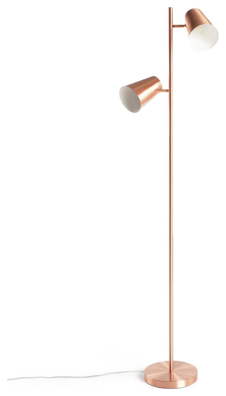 Illumination you'll love. Add a touch of luxe to your home with our copper floor lamp. It's compact base and slim stem makes for a versatile piece. The 2 directional lamps are ideal for lighting a cosy reading corner or for highlighting a favourite piece of art. A great choice for lounge, bedroom, or office. The metallic accents bring mid-century glamour at the flick of a switch.