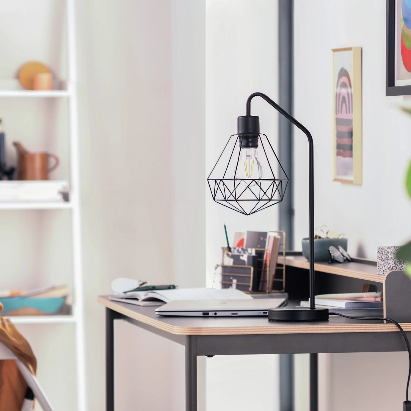 Get an industrial vibe and architectural looks all in one with our cool Kanso table lamp. What a smart choice with a geometric cage for a shade. Looks good on or off. Day or night. A modern classic with a painted, matt black stand. Stunning. Simple. Versatile for living room, bedroom or even study.