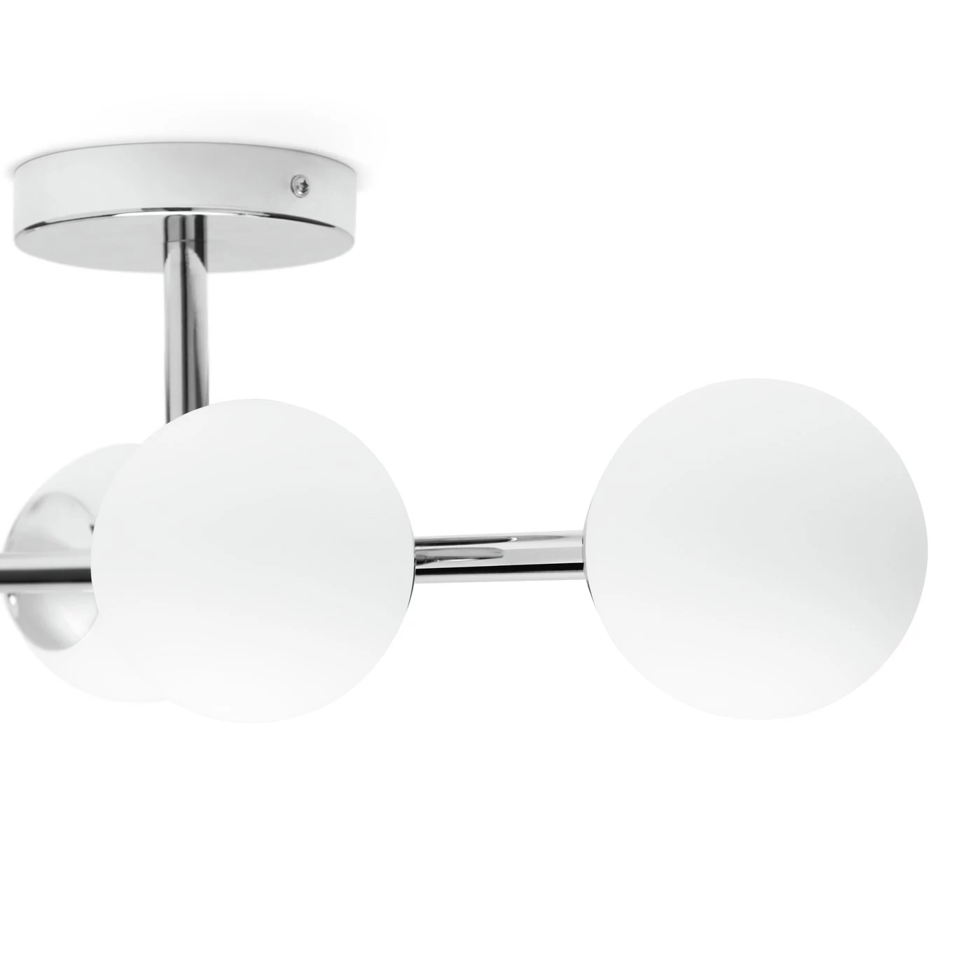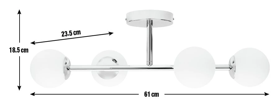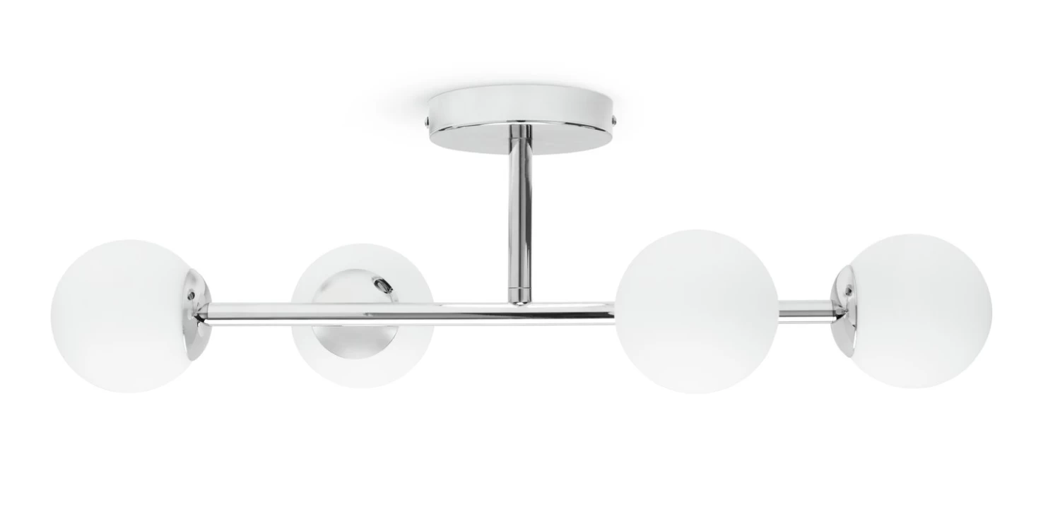 Our glass orb lighting feature is as at home in the living area as it is in the bathroom. Bringing a twist of modernity to a classic style. A highly polished chrome bar supports four opaque glass globes. And as it's flush-fitting, you don't need a high ceiling to create an impact.