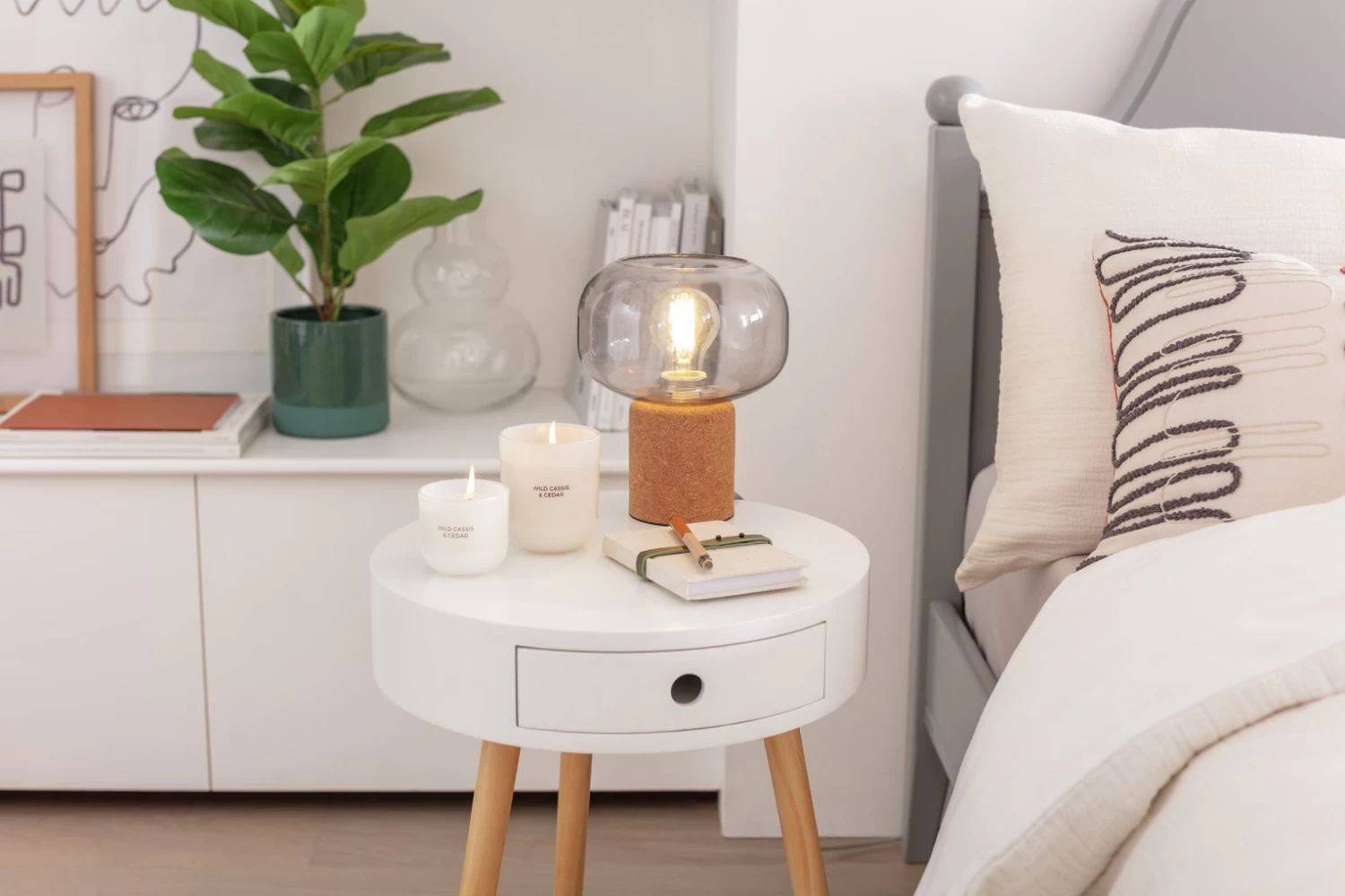 Simple design with an industrial spin. With a base finished in natural cork and a lightly smoked glass shade, Pallas creates a soft glow to give your room just the right ambience. Ideally placed on a desk or side table, this lamp is sure to inspire creativity in abundance. The elegant, rounded silhouette and minimalist design will give your decor an instant uplift.