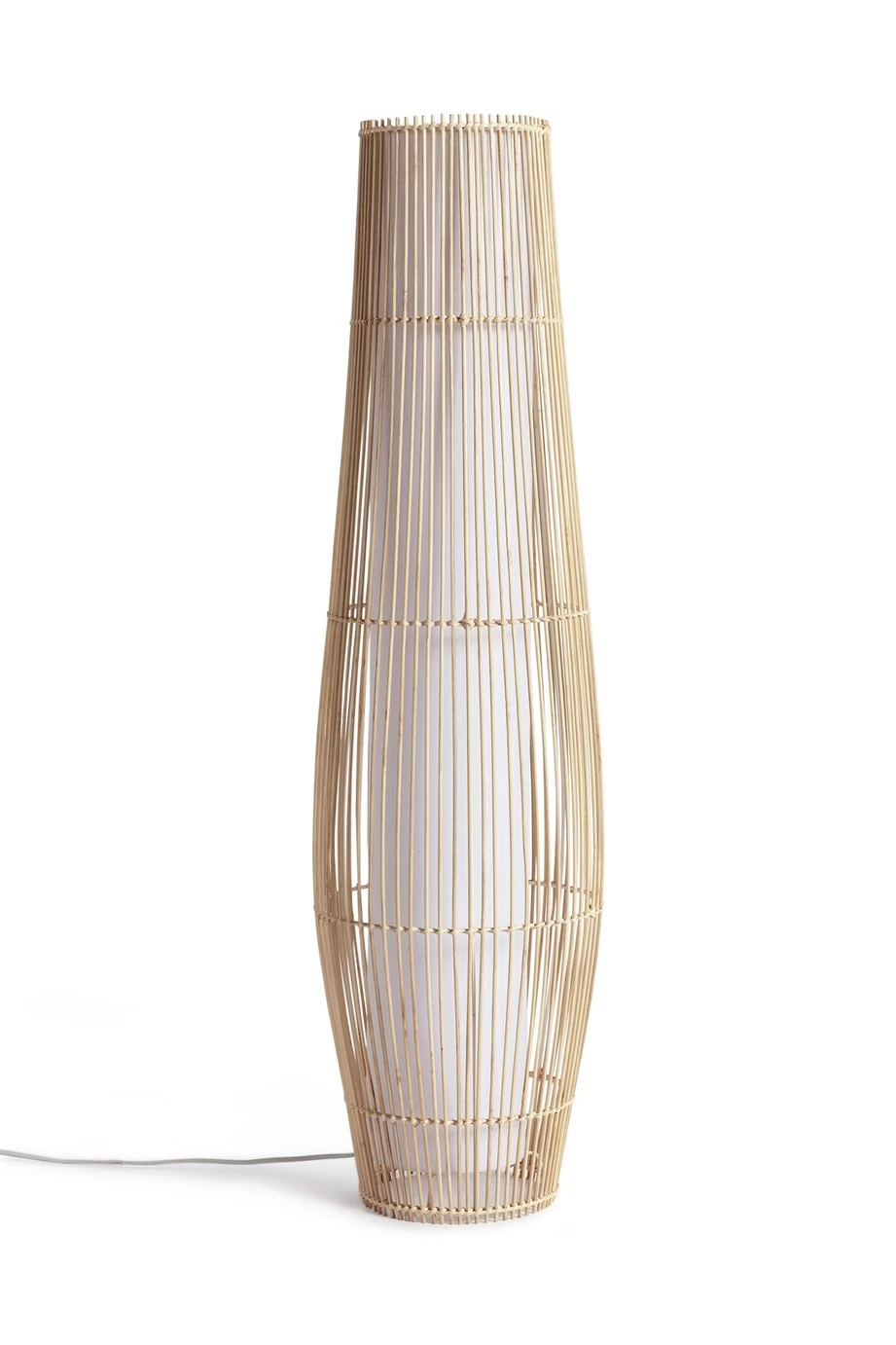 Moody and relaxed lighting. Ethnically inspired, this beautiful, tall rattan floor lamp is the perfect centre piece for any chilled, Boho setting. A combination of natural rattan and low energy light bulbs. The curved frame sits 112cm tall and encloses a white paper shade. Tap the foot switch to create a calm and mindful mood. And chill.